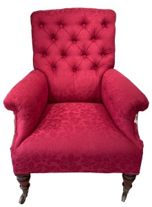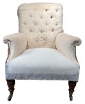 The biggest problem was that the front rolled edge had collapsed and the seat felt curiously soft. The pleats on the deep buttoned back had gone but otherwise the stuffings of the back and arms seemed OK. And the frame was in great shape.